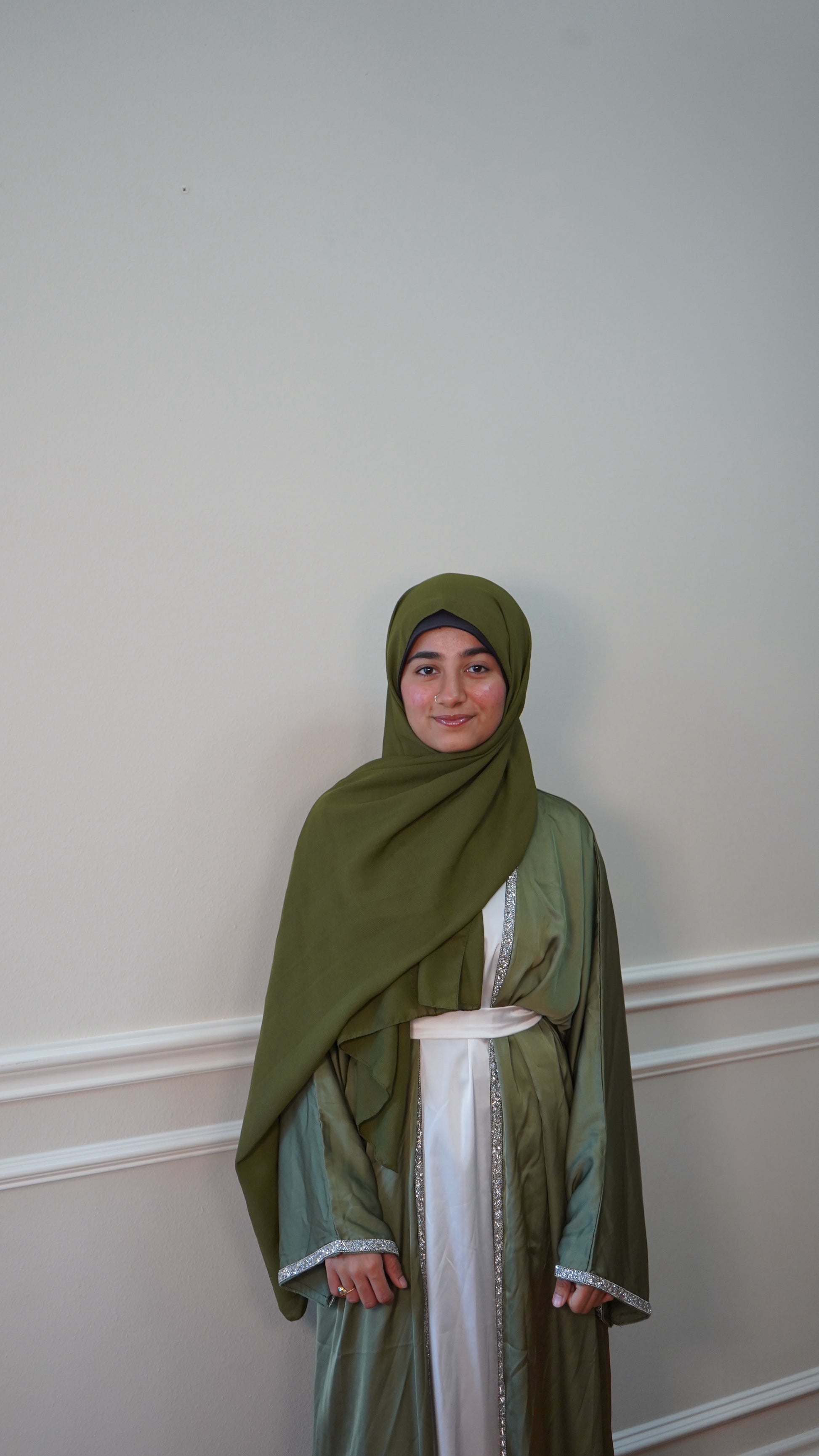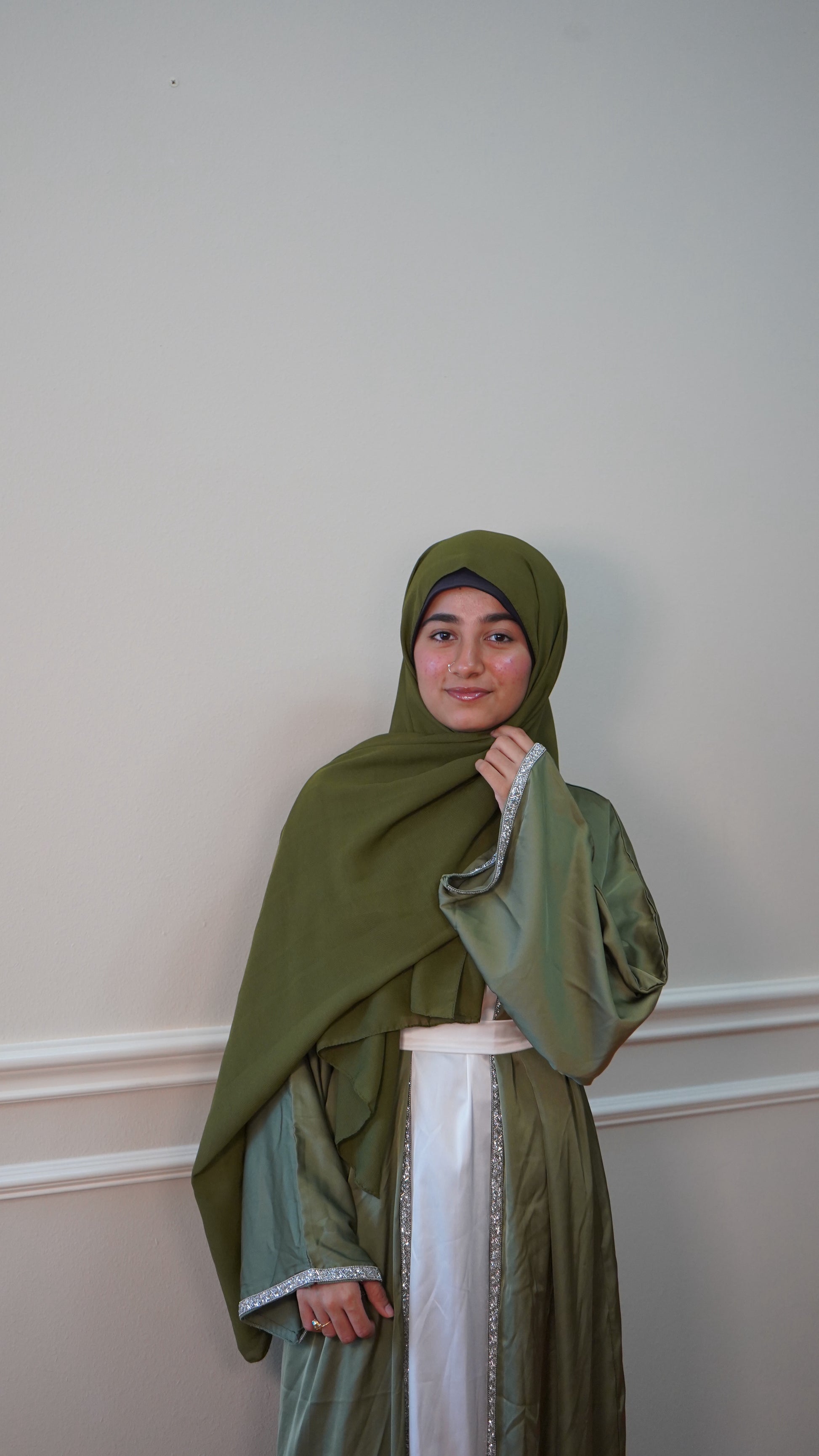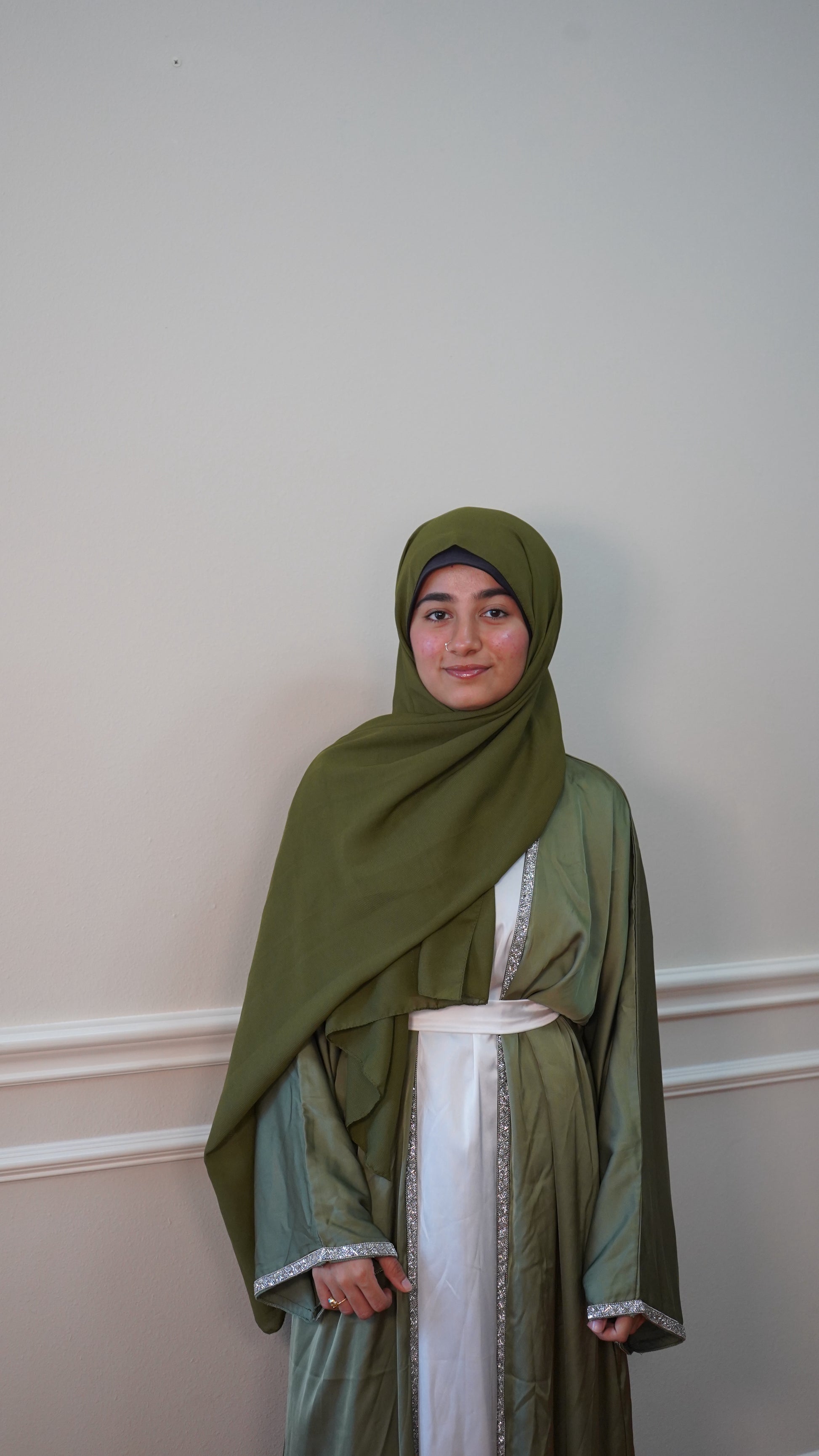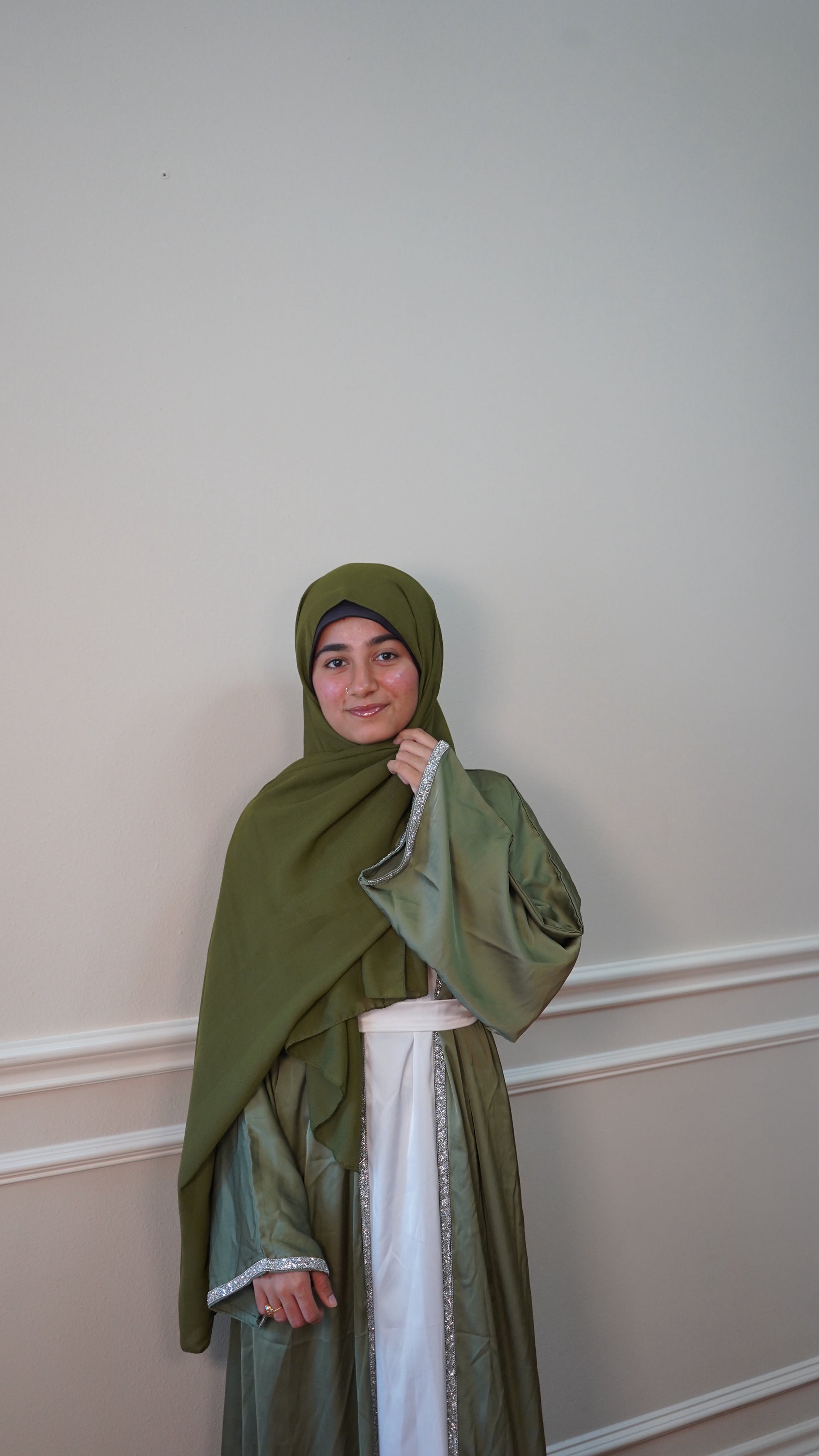 This green and white 4 piece abaya includes a belt and hijab, offering a stylish and convenient ensemble for any occasion. Made from high-quality materials, this abaya provides comfort and durability. Elevate your wardrobe with this versatile and elegant piece.